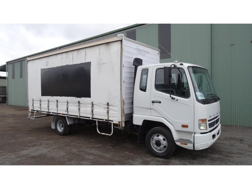 MITSUBISHI FUSO FK600 8 PALLET CURTAINSIDER/ PAN, YEAR-07/2008, 240 HORSEPOWER, 6 SPEED MANUAL, 499,800 KMS, 10400 GVM, 16000 GCM, 4X2, SPRING SUSPENSION, 4280 MM WHEELBASE, 5400 MM L X 2400 MM W X 2210 MM H ( INSIDE MEASUREMENTS ) , PAN ON THE LEFT SIDE WITH SIDE DOOR AND CURTAINSIDER ON THE RIGHT, REVERSING CAMERA, S/N – 2000, PRICE-$ 29,900.00 INC GST ,, LOCATED IN ARMIDALE NSW.