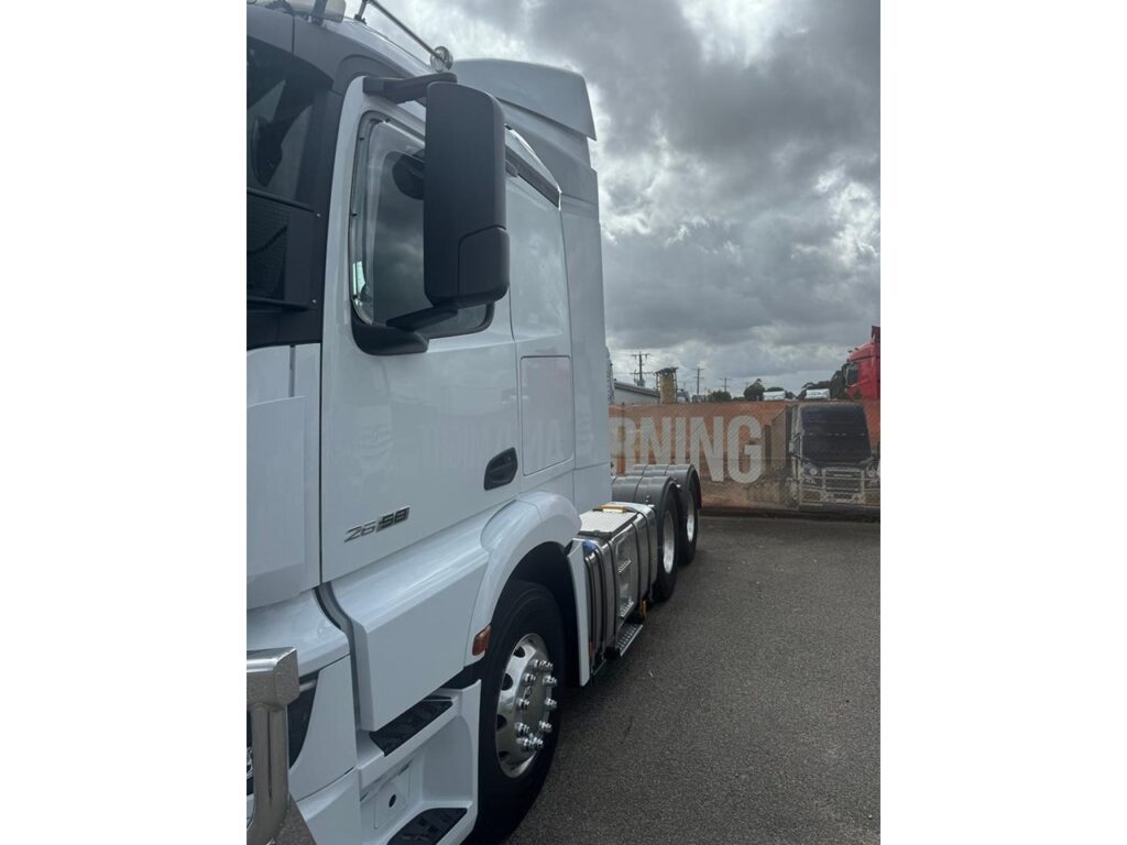 Cabin – Kerb mirror and main mirror, manoeuvring setting, co-driver’s side – Driver and co-driver sunblind – Seat belt monitor – Air horns, cab roof – Air deflector, snap-in, with cab side deflectors – Sun visor exterior transparent with chrome highlight – TrendLine interior design with ambient lighting, chrome trim, carpet on engine tunnel – Leather steering wheel – Driver and co-driver air sprung comfort leather suspension seat – Luxury bed, bottom, inner spring – Luxury bed, top, wide, with levelling control – Multimedia Cockpit, interactive – Comfort telephony, wireless charging – Cruise control and speed limiter – Travel computer, on-board diagnosis and maintenance system – Truck navigation – DAB radio – Premium loudspeaker system with additional speakers – 24 V/15 A co-driver footwell sockets – Automatic climate control – Pull out tray table on passenger side – Stowage flap and compartments above windscreen – Stowage compartment exterior flap, left and right – Mercedes star, illuminated from behind in dark chrome – Dark chrome badging – Two 30 l pull-out refrigerators under bunk